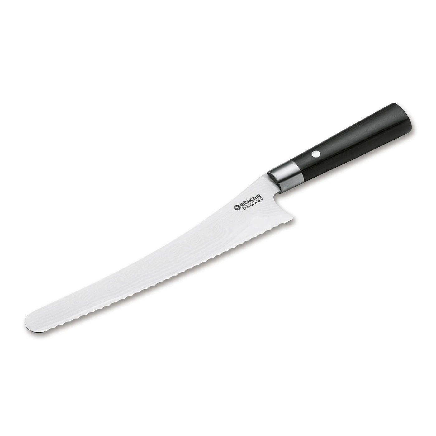 The Bread Knife is characterized by the special serration, as well as the very long blade. In addition to bread, other hard foods can also be cut very well. In contrast to the classic Kitchen Knife these are not crushed when cutting with the Bread Knife. – 130423DAM – 2 – A44-3