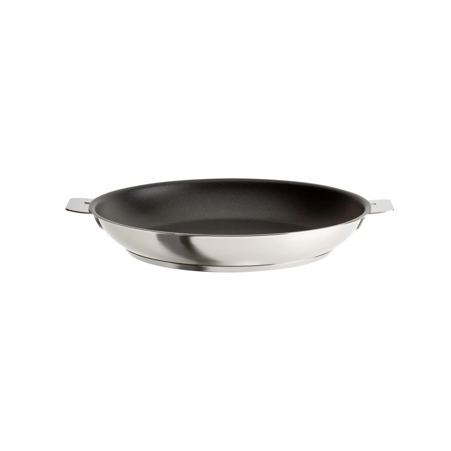 18/10 stainless frying pan with removable handle, brushed finish and Excalibur non-stick coating. Removable Strate collection. Stainless frying pans with a non-stick coating are ideal for browning and cooking fish, potatoes, eggs, etc. without sticking. For grilled meat, a stainless frying pan is the most suitable. For its frying pans, Cristel uses the Excalibur non-stick coating. Requires a removable handle. – P22QLE – 2 – W28