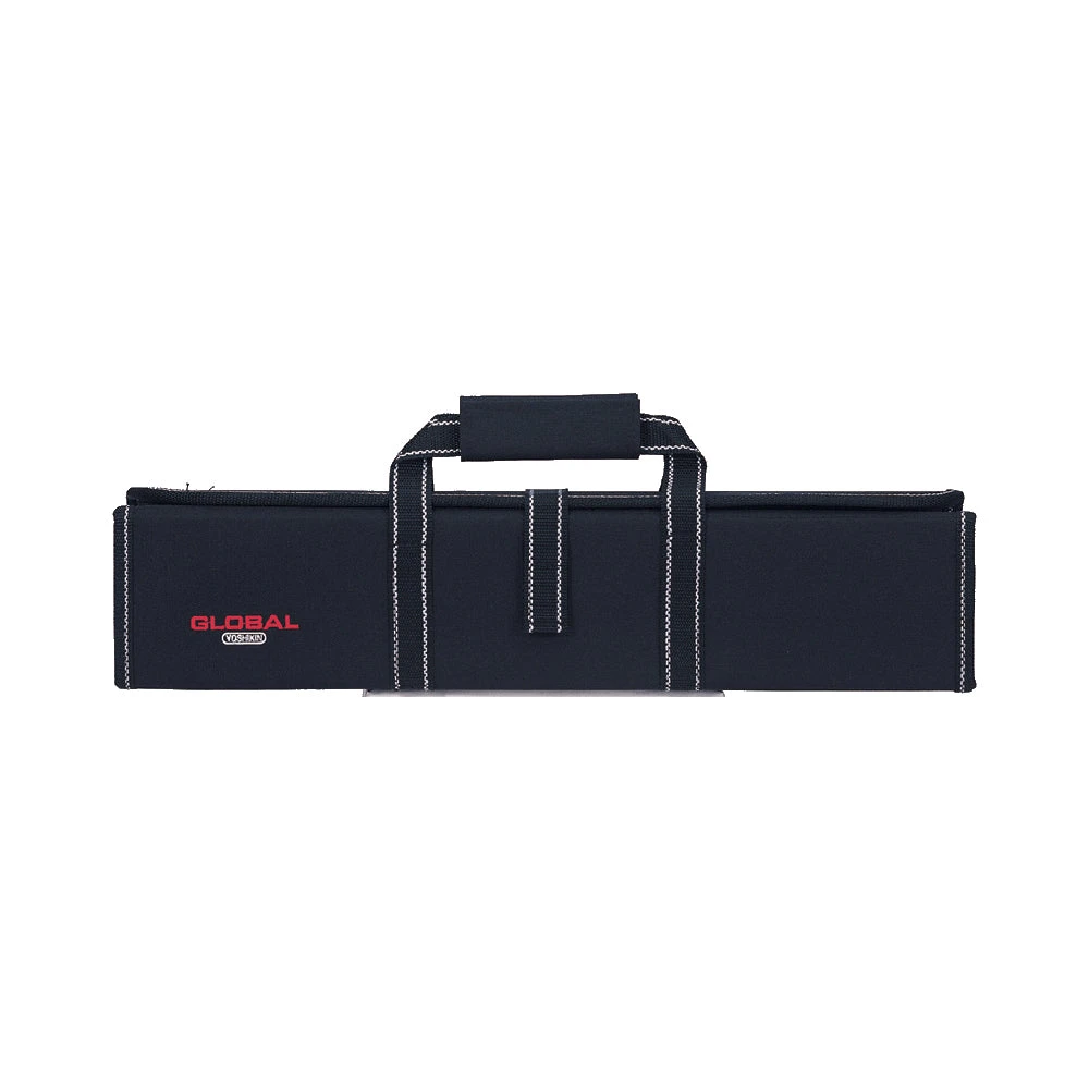 Hard knife case with a carrying handle and velcro straps to keep the case folded. It holds eleven knives. The knives are secured inside the case with a zipper enclosure. It is made of black, heavy-duty Denier nylon which is durable and easily cleaned with mild soap and water. The case features the Global logo and white stitching as an attractive contrast. – G-667/11 – 1 – A119