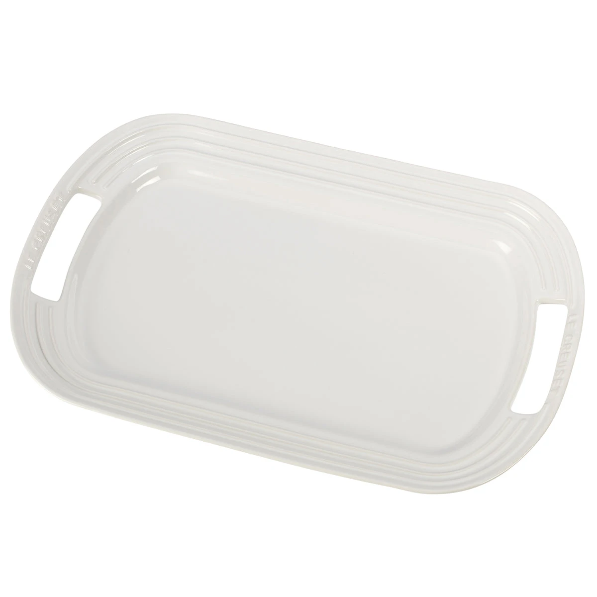 Large enough for a multitude of uses, the stoneware serving platter features ridged edges that slope upward to contain food, while two wide handles are cut into each end to ensure a steady grip when carrying heavier foods like roasts or poultry to the table.