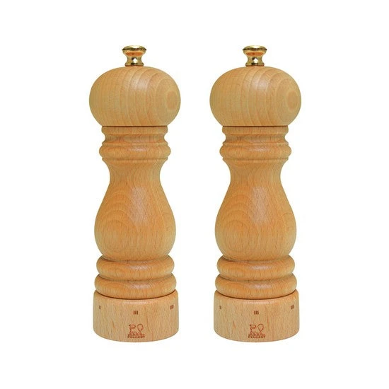 As leaders in their industry, Peugeot has never been matched in design or quality. Peugeot has been producing salt and pepper mills since 1842. For pepper mills, hardened steel is preferred over stainless. Peugeot uses two size grooves, called Channeling and Grinding. The Channeling grooves, larger grooves are designed to line up the peppercorns to crack them. While the Grinding grooves, smaller grooves do the actual fine grinding. For salt mills, a commercial grade of stainless steel is used. This is done to help keep the salt from corroding the grinder mechanism. If it is a Paris u’Select mill that you are considering, the grind is adjusted by turning the ring at the bottom. Once the grind size is set, it will stay in place until the user changes it. Mills are made using a high quality beech wood, grown in France.