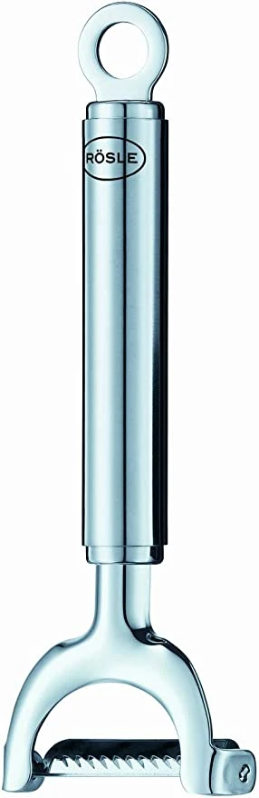 Designed and engineered in Germany; made of 18/10 stainless steel. Peeler cuts fine decorative strips perfect for garnishes, salads and wok dishes. Handle is round, can be used comfortably with the left or right hand. Handle is filled on either end with a high-grade epoxy cement. This makes it water tight, anchors the head securely and gives the tool good weight and balance. – 12727 – 2 – A112-A