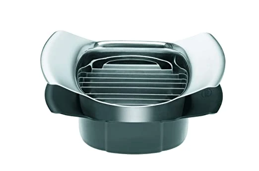 With 10 parallel serrated blades tomatoes or mozzarella cheese are neatly cut into equal slices. The base from synthetic material ensures a neat and perfect cut right through. Two handles for a safe grip and ergonomic work. – 12755 – 2 – B45-3