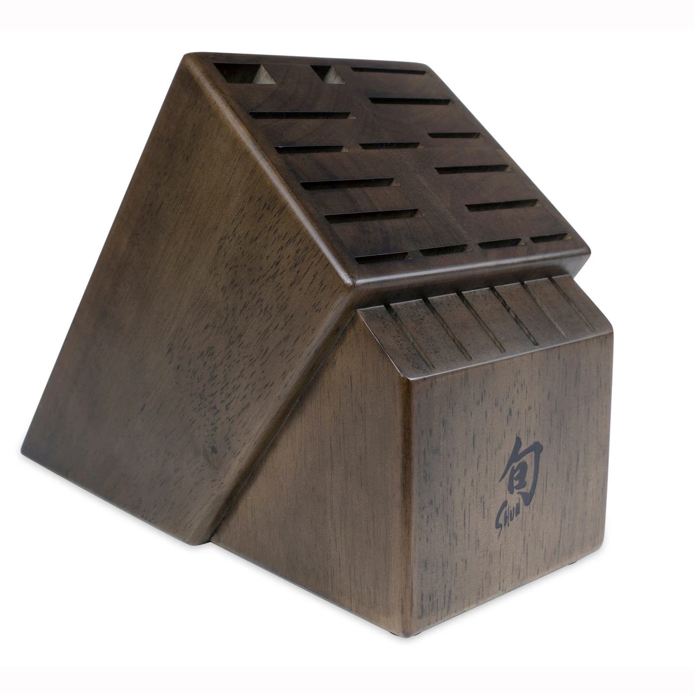 You’ll love this beautiful solid wood block that holds up to 22 pieces of kitchen cutlery. The Shun 22-Slot Block is big enough to display a large Shun collection beautifully on your countertop. This handsome block includes slots for your honing steel, kitchen shears, and can even hold up to six steak knives. Everything stays within easy reach when you keep this block in your kitchen. This attractive block is made of solid wood with an attractive dark wood stain. To keep it clean, just wipe with a damp cloth.