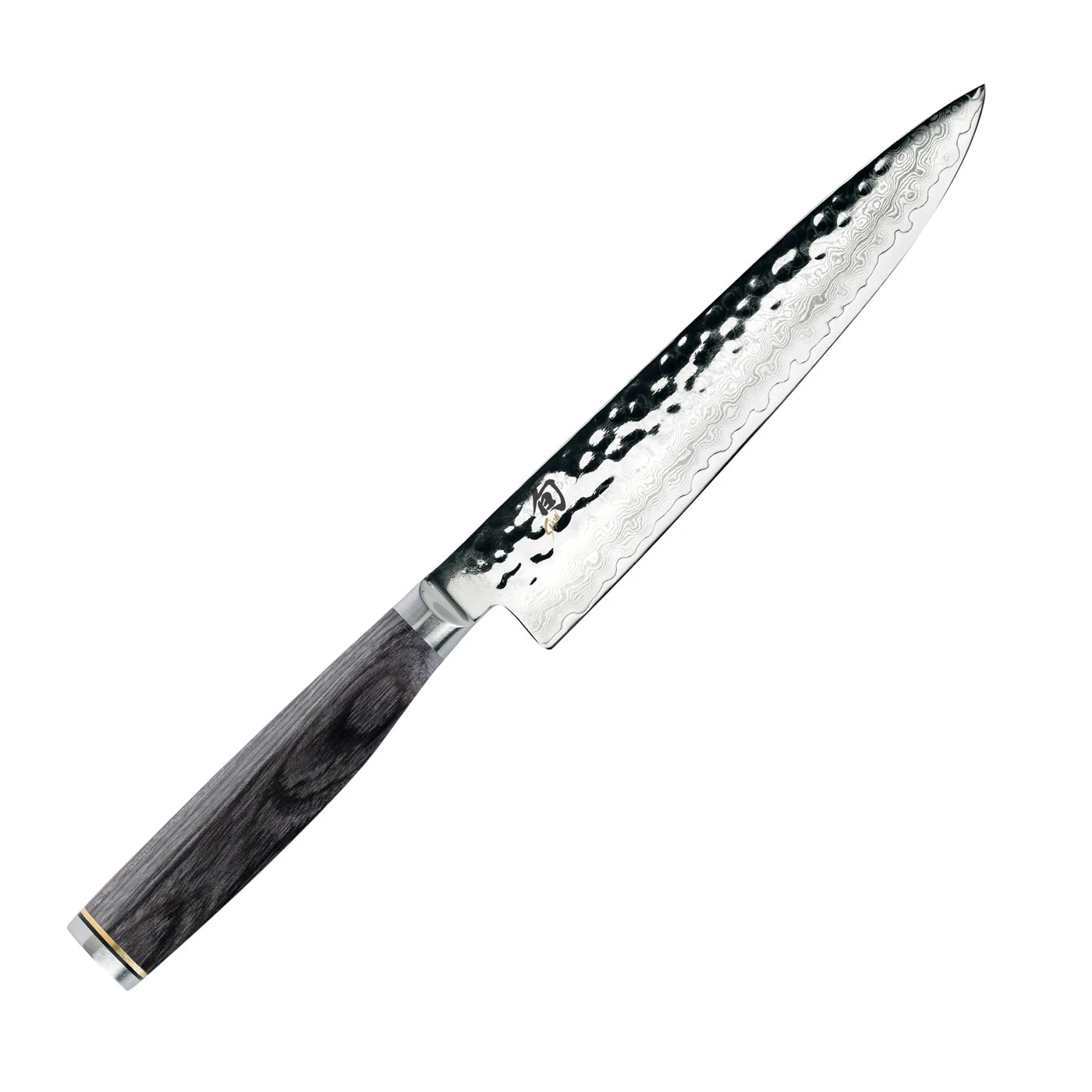 A utility knife is the third member of your must-have triad of kitchen knives. With its 6.5-inch blade, the Shun Premier Grey Utility Knife is between a chef’s knife and a paring knife in size. It is ideal for all those in-between-sized tasks, from trimming vegetables to slicing sausages. For any job that takes precision, the utility knife is a top choice. Sophisticated, grey Pakkawood handles and a razor-sharp edge enables you to make quick work of a wide range of cooking tasks—using a gorgeous knife that you will enjoy using every time.