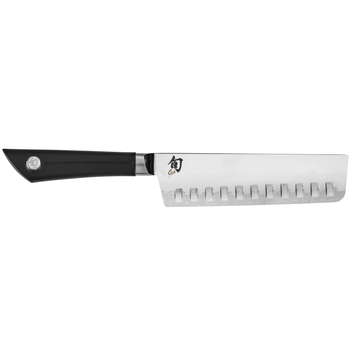 A nakiri is a Japanese-style vegetable knife. Once you get the Shun Sora Hollow Ground Nakiri in your hands, you will see why both professional chefs and good cooks around the world choose this beautiful and extremely useful tool whenever they have fruits or vegetables to prepare. With its straight blade, edge, and spine, the nakiri is used with a simple push cut. You will love the clean, swift work it makes of vegetables of all kinds. For daily salad preparation or slicing vegetables for stir-fry, it cannot be beat. Finely dicing onions is fast, easy, and with the Shun Sora Hollow Ground Nakiri’s blunt end, safer, too. The hollow-ground indentations on the side of the blade create small air pockets that reduce friction when cutting, making it easier to glide through each cut. Perfect for processing vegetables, fruits, and foods of all kinds. Proprietary Composite Blade Technology puts high-performance VG10 steel on the cutting edge and highly corrosion-resistant Japanese 420J stainless steel on the blade upper. San mai edge construction protects and supports the VG10 cutting core; razor-sharp 16° edge each side for quick, easy cutting. Traditional handle design in textured PP/TPE polymer blend provides a contemporary look, secure grip and balance, and is easy to maintain. Blade tang extends all the way to the embossed handle medallion for strength and balance. Handcrafted in Japan. – VB0739 – 2 – B81-3