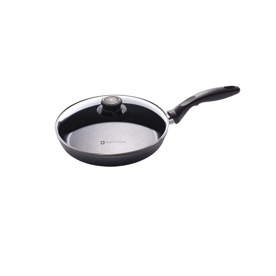 Arguably the most versatile cookware model available, the Swiss Diamond Fry Pan is a must-have for any kitchen. This do-it-all 9.5 inch skillet (24 cm) is a perfect wedding present, housewarming gift, or even a gift to yourself as it’s the perfect size for cooking for two. Brown a chicken breast like stainless steel on the patented nonstick coating, then use the fond to create a gravy – or simply wash with hot soapy water, no scrubbing or soaking. Swiss Diamond’s thick and heavy bottomed pan construction ensures an even cooking surface that allows for perfect cooking every time. Includes heat-tempered glass lid. – 6424c – 2 – W41