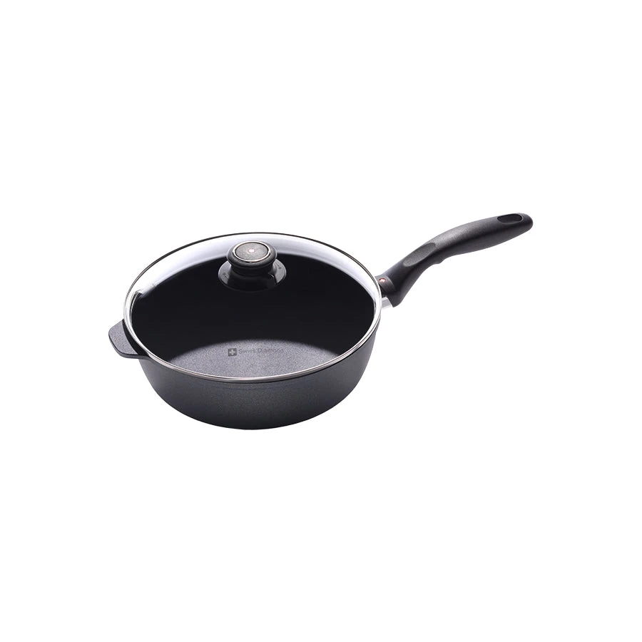 The Swiss Diamond 3.2-quart (9.5 inch) Saute Pan is ideal for cooking enthusiasts in search of a versatile addition to their cookware collection. High-quality and durable, this pan is guaranteed to transform your everyday cooking experience. The patented coating contains real diamond crystals and consistently delivers delicious results followed by easy clean-up. The cast aluminum body distributes heat evenly and efficiently. Use the heat-tempered glass lid to monitor your food and truly seal in the flavor. An adjustable valve located on the lid handle allows you to easily release or contain steam. Oven-safe up to 260°C (500°F). Made in Switzerland. – 6724c – 14 – W46