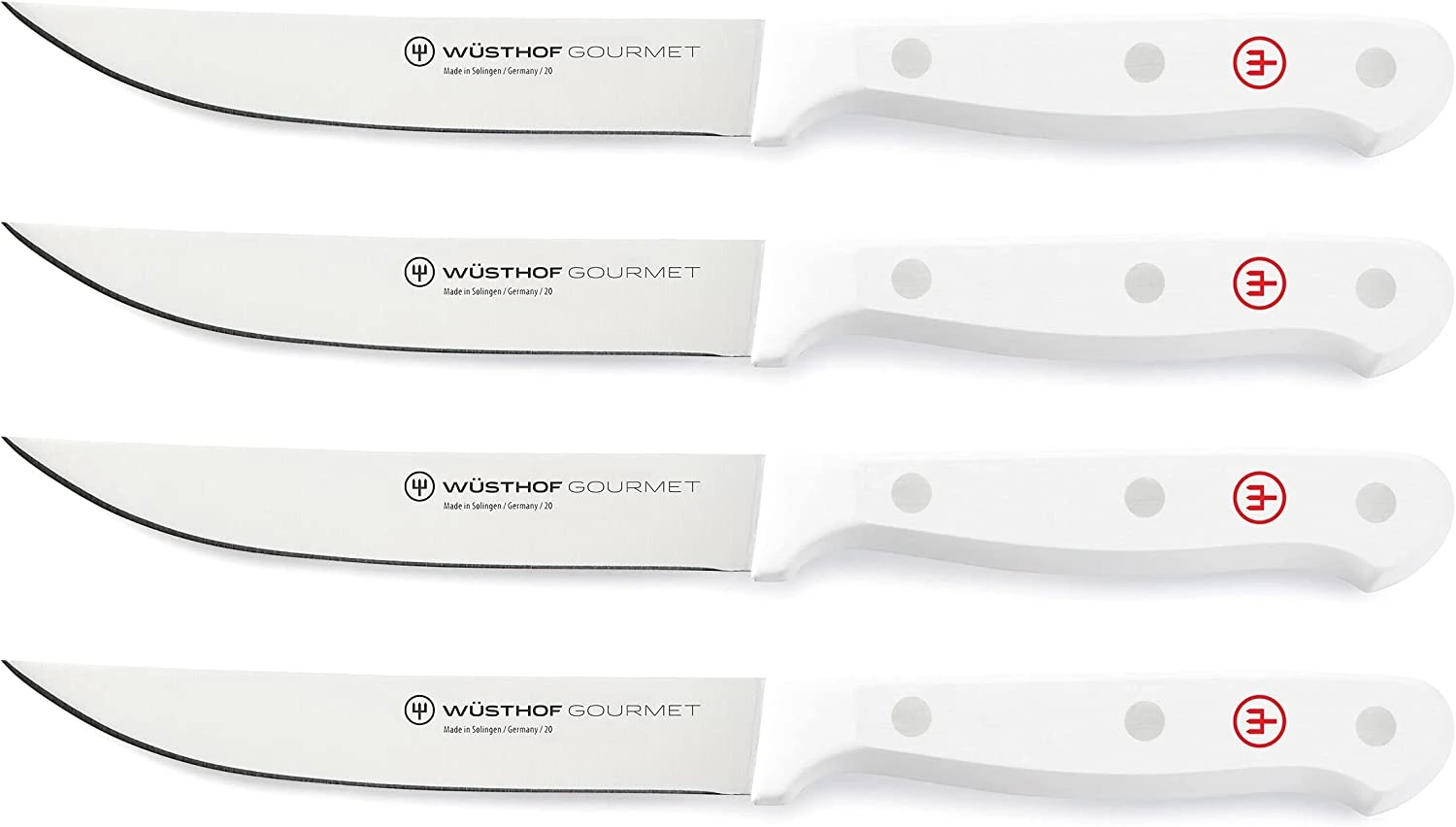 GOURMET laser-cut, stamped, and full-tang knives are crafted in the company’s factory in Germany. The WÜSTHOF GOURMET White 4-Piece Steak Knife Set (model 9729-0), comprised of four laser-cut high-carbon stain-free knives with elegant white handles. – 1125460401 – 38 – B220-1